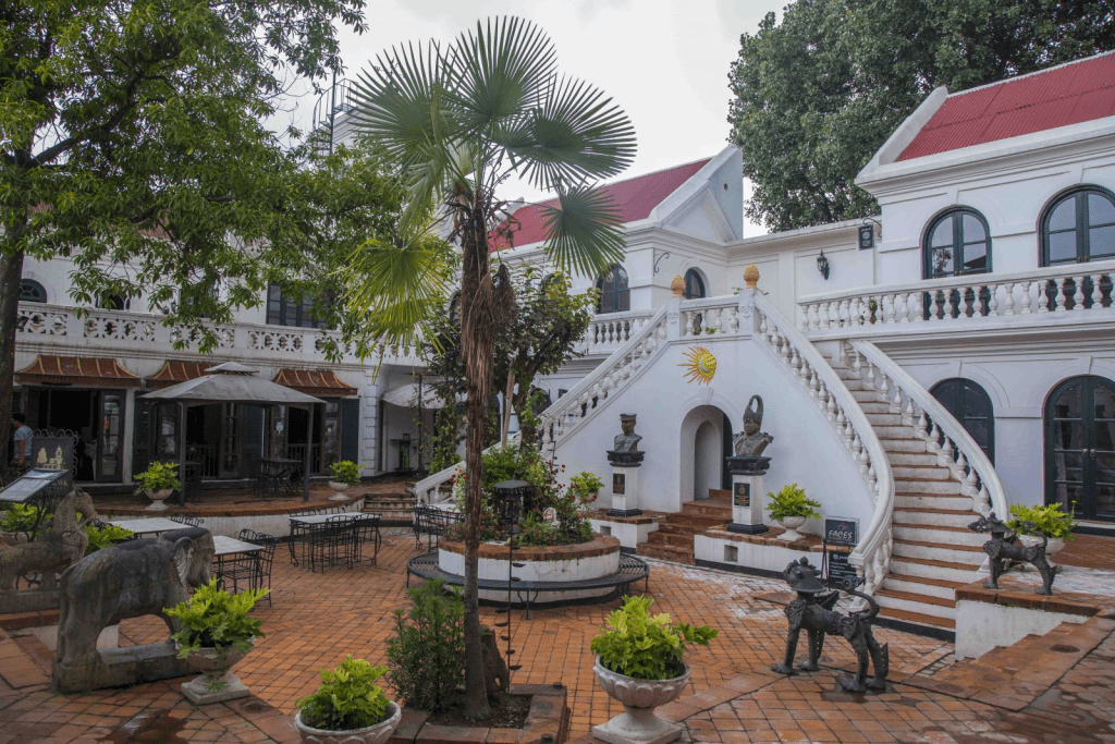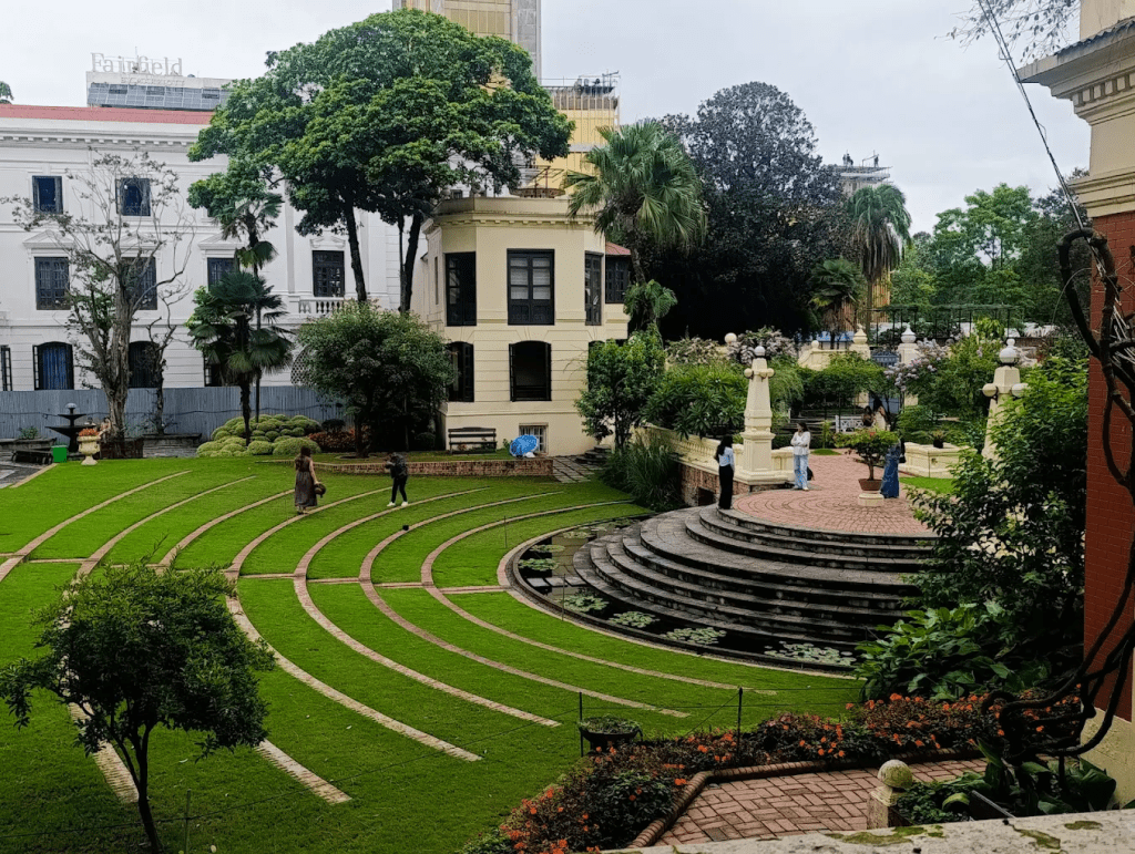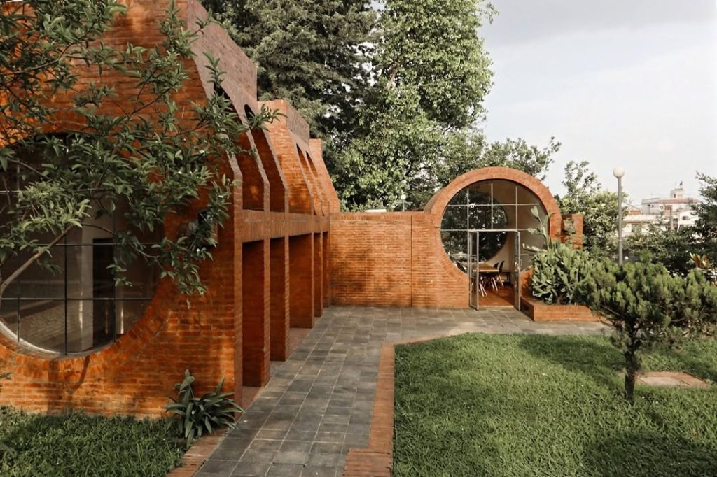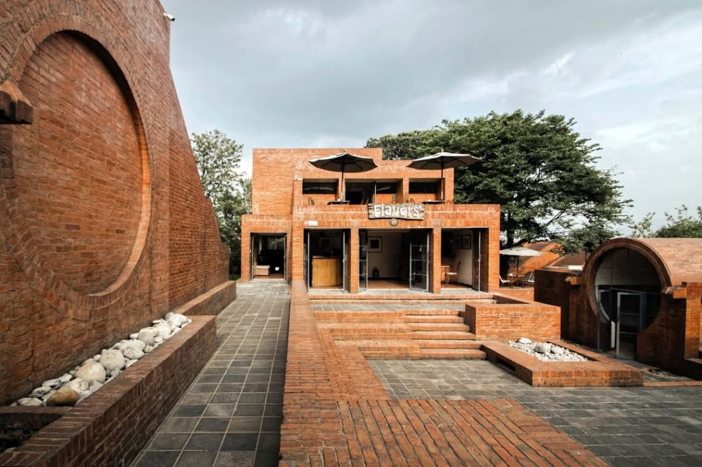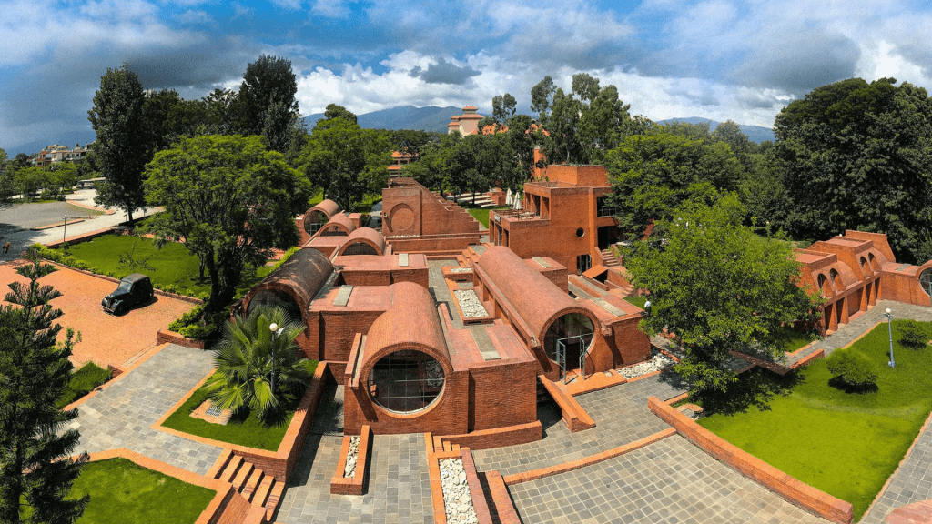 Its dark red brick facades, barrel-vaulted rooms, and intricate Newari-inspired motifs make it visually striking.