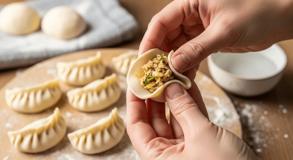 Step 4) Fill and fold (basic pleated “round momo”)