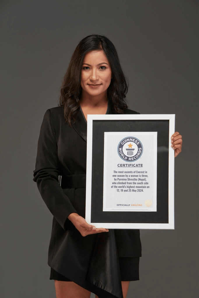 KATHMANDU, March 8, 2026 – Renowned Nepali mountaineer and photojournalist Purnima Shrestha has officially secured her place in the Guinness Book of World Records by becoming the first woman to scale Mount Everest three times within a single climbing season.