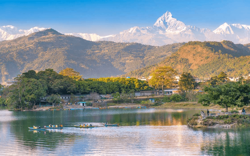 The trail begins with a boat ride across Phewa Lake to the trailhead, which takes four days. The lake is located just north of Pokhara, Nepal. It travels through a biodiverse protected forest with a diverse range of flora, including orchids. Dhaulagiri, Annapurna I, Manaslu, Machhapuchhare, Lamjung, and Gangapurna are just a few of the mountains visible from the trek.
