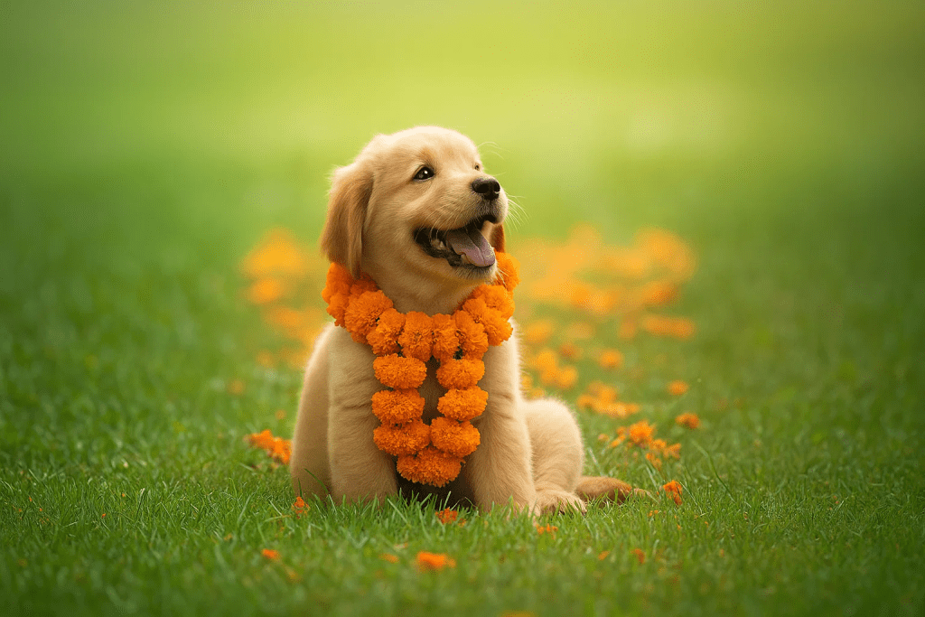 Kukur Tihar, or the Nepali Dog Festival, is one of the most heartwarming days of Tihar. Dogs—whether pets or strays—are worshipped with garlands, tika, and delicious meals. They are recognized as the loyal companions and gatekeepers of Yama. The red tika and marigold garlands symbolize respect, love, and the bond between humans and animals. Even police dogs receive special honor for their service.