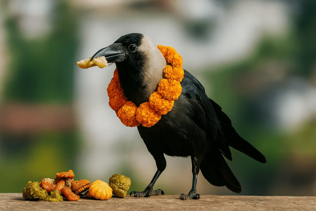 The festival begins with Kaag Tihar, the day of crows, believed to be messengers of Yama, the God of Death. People offer rice, grains, and sweets to crows to prevent misfortune and maintain peace in the coming year. The sight of fluttering crows enjoying offerings on rooftops marks the start of the festival’s spiritual rhythm.